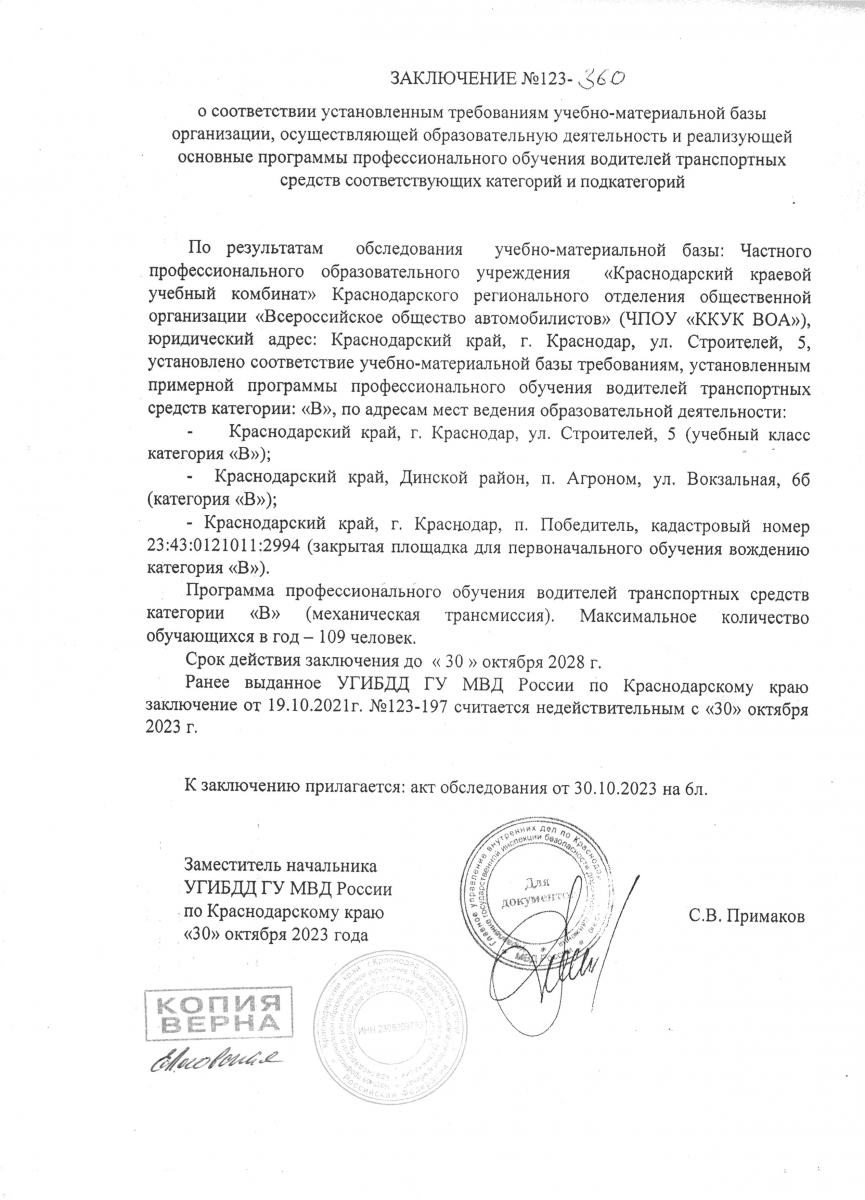 Частное профессиональное образовательное учреждение «Краснодарский Краевой Учебный Комбинат» Краснодарского регионального отделения общественной организации «Всероссийское общество автомобилистов» при реализации образовательных программ руководствуется: Федеральным законом Российской Федерации от 10 декабря 1995г. № 196-ФЗ «О безопасности дорожного движения», Федеральным законом Российской Федерации от 29 декабря 2012 г. № 273-ФЗ «Об образовании в Российской Федерации», Постановлением Правительства РФ от 01.11.2013 N 980 «Об утверждении Правил разработки примерных программ профессионального обучения водителей транспортных средств соответствующих категорий и подкатегорий», Приказом Минпросвещения России от 26.08.2020 N 438 «Об утверждении Порядка организации и осуществления образовательной деятельности по основным программам профессионального обучения», приказом Минпросвещения России от 08.11.2021 N 808 «Об утверждении примерных программ профессионального обучения водителей транспортных средств соответствующих категорий и подкатегорий», Приказом Минпросвещения России от 26.09.2022 N 861 «О внесении изменений в приказ Министерства просвещения Российской Федерации от 8 ноября 2021 г. N 808 «Об утверждении примерных программ профессионального обучения водителей транспортных средств соответствующих категорий и подкатегорий», Постановлением Правительства РФ от 18.09.2020 N 1490 «О лицензировании образовательной деятельности».